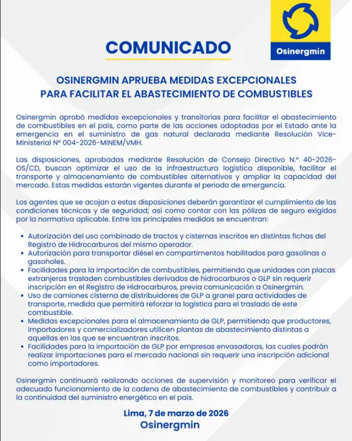 El Organismo Supervisor de la Inversión en Energía y Minería (Osinergmin), dada la crisis de suministro de gas natural que sufre el país (y más Lima), aprobó un número de medidas excepcionales para garantizar el abastecimiento de combustibles. Con una resolución de su consejo directivo, flexibilizó temporalmente las reglas de transporte, almacenamiento e importación de combustibles.