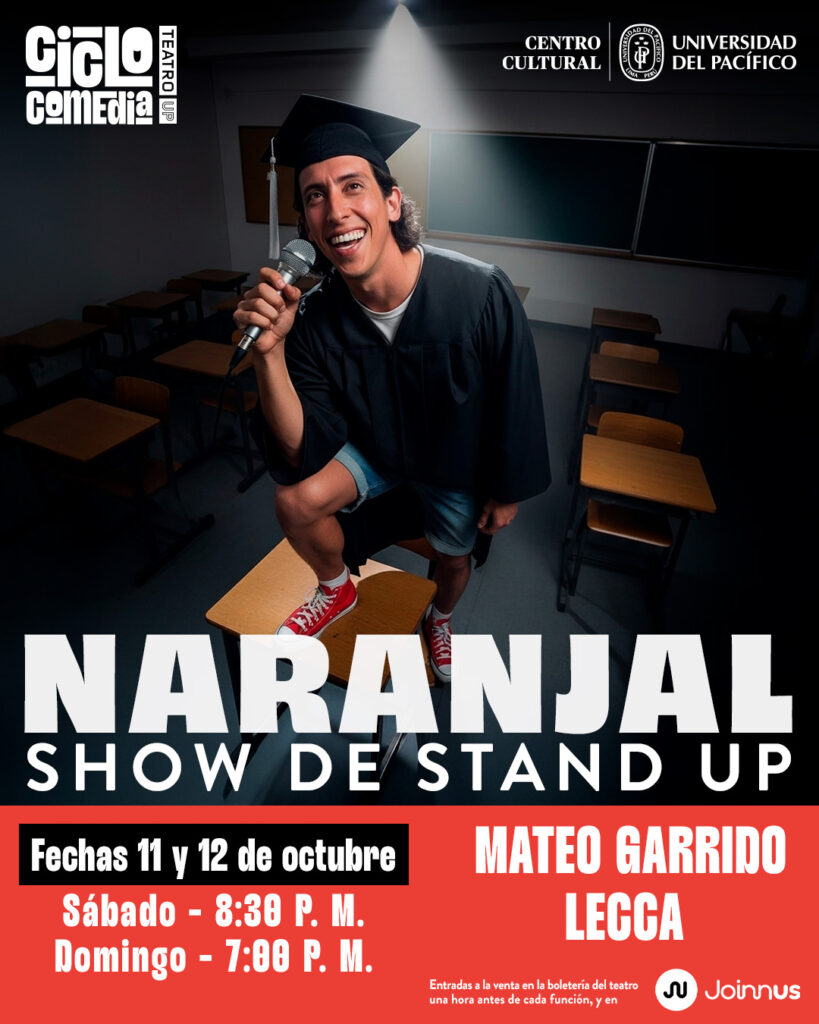 CICLO COMEDIA se presentará del 18 de octubre al 29 de noviembre en el Teatro de la Universidad del Pacífico, ubicado en Jr. Luis Sánchez Cerro 2121, Jesús María. Las entradas ya están disponibles a través de Joinnus y una hora antes en la boletería del teatro.