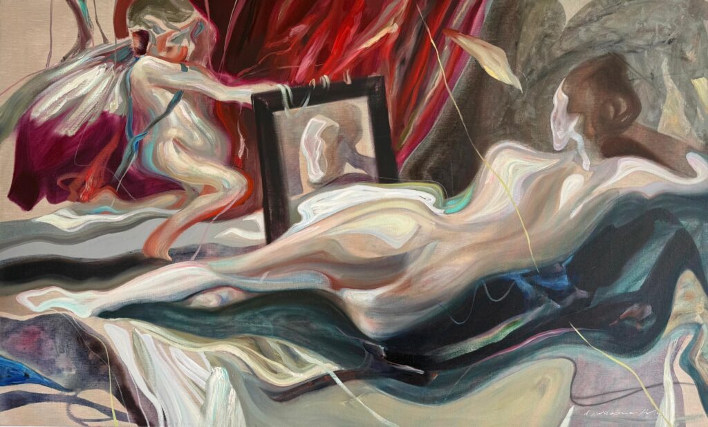 La tradición pictórica es evocada para luego ser sometida a un proceso de disolución, torsión y extrañamiento. Las escenas remiten a interiores clásicos, figuras sentadas o reclinadas, vestimentas antiguas y composiciones reconocibles, pero nada permanece intacto: lo que vemos son restos, fragmentos y huellas de imágenes que sobreviven deformadas por el tiempo y la subjetividad.