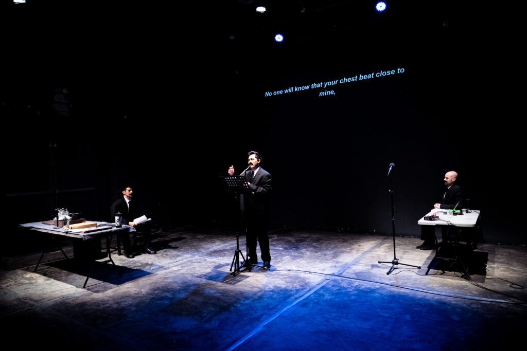 La obra utiliza un dispositivo inspirado en los antiguos estudios de radioteatro de los años 60. Todos los sonidos son creados en vivo por los intérpretes —los pasos, los golpes, los besos, la lluvia, los efectos de ambiente— mientras el soundtrack grabado refuerza la atmósfera emocional de cada escena, apoyado en la reinterpretación de siete canciones de música criolla peruana desde la perspectiva queer. Esta combinación entre lo analógico y lo performativo sitúa la acción en un territorio ambiguo entre la radio y el teatro, entre la ilusión sonora y la presencia física. El escenario se convierte así en un espacio de invención constante, donde el público asiste a la construcción de una ficción en tiempo real, revelando los mecanismos de lo audible y lo visible.