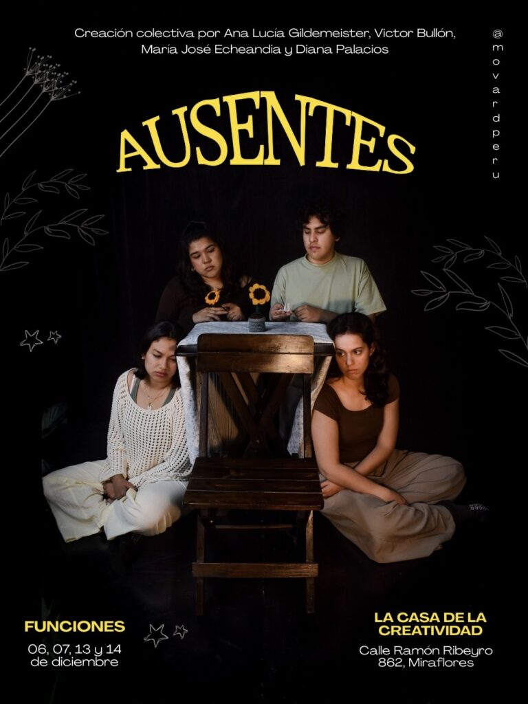 El colectivo teatral Movard presentará la corta temporada de Ausentes, creación colectiva de Ana Lucía Gildemeister, María José Echeandía, Víctor Bullón y Diana Palacios. La puesta en escena se estrenará el sábado 6 de diciembre a las 8:00 p.m. en la Casa de la Creatividad en Miraflores.