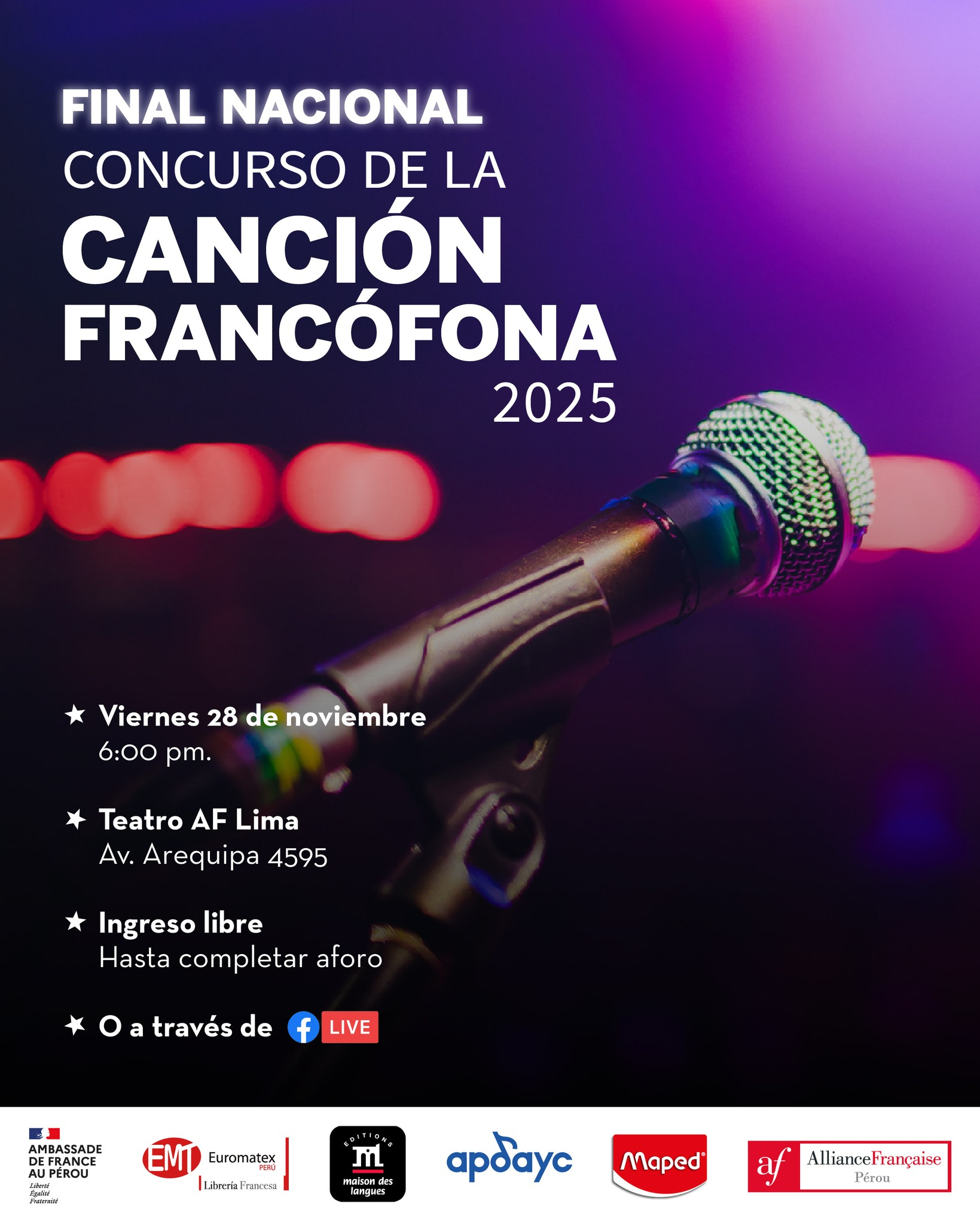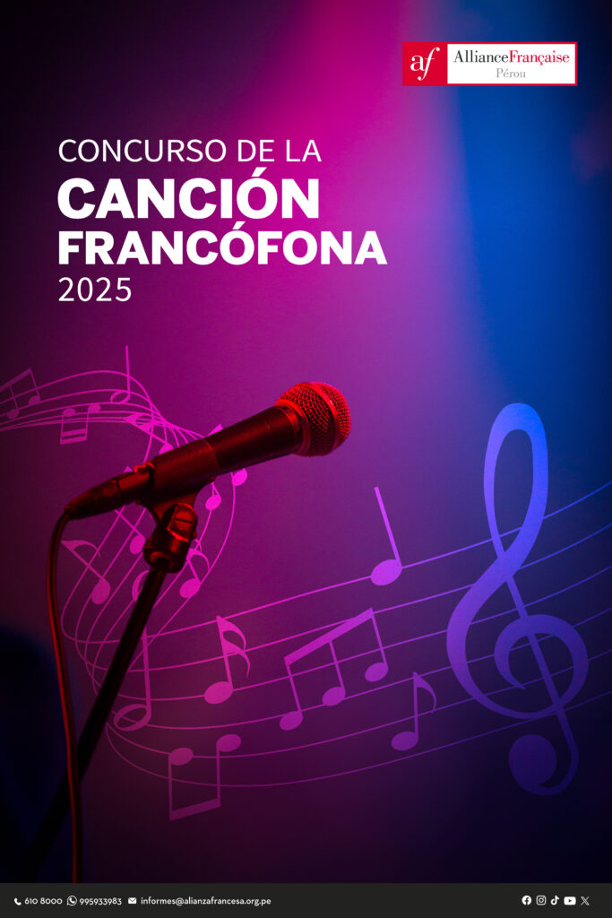 Lima, noviembre de 2025. La gran final nacional del Concurso de la Canción Francófona 2025 se realizará este viernes 28 de noviembre, en el Teatro de la Alianza Francesa de Lima. El evento reunirá a jóvenes talentos de todo el país que comparten su pasión por la música y la lengua francesa.