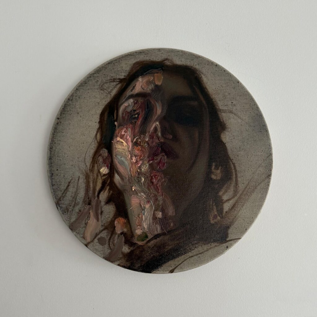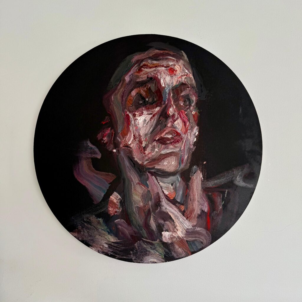 En sus referentes resuenan artistas que también desarmaron el rostro para reimaginarlo: Rembrandt, con sus autorretratos introspectivos; Francis Bacon y Frank Auerbach, con sus visiones distorsionadas y viscerales del cuerpo; o Jenny Saville, con sus figuras crudas y desaforadas que desafían el canon.