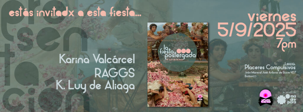 Madrépora Editorial te invita a un encuentro con la poesía que sacude el tuétano. La espera ha terminado: La fiesta postergada, la nueva y poderosa colección de poemas de la escritora K. Luy de Aliaga, llega para ser presentada este viernes 5 de septiembre a las 7:00 p.m. en la librería Placeres Compulsivos (Jirón Colina 117, Barranco, Lima).