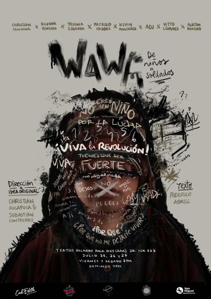 A través de la combinación de teatro físico y escenas teatrales realistas, la obra mezcla elementos oníricos para exponer las consecuencias de la violencia en los niños, el robo de su infancia y la vulneración de sus derechos humanos en un contexto de guerra y opresión. Con esta sensibilización, “Wawa…” busca promover una cultura de respeto y protección a los derechos infantiles y valorar la memoria histórica de este periodo crítico para la nación. Forman parte del elenco: Christian Cahuana, Kevin Montañez, Silvana Ventura, ACU, Yesenia Zegarra, Patrizio Fabbri, Vitto Céspedes y Airton Romero.