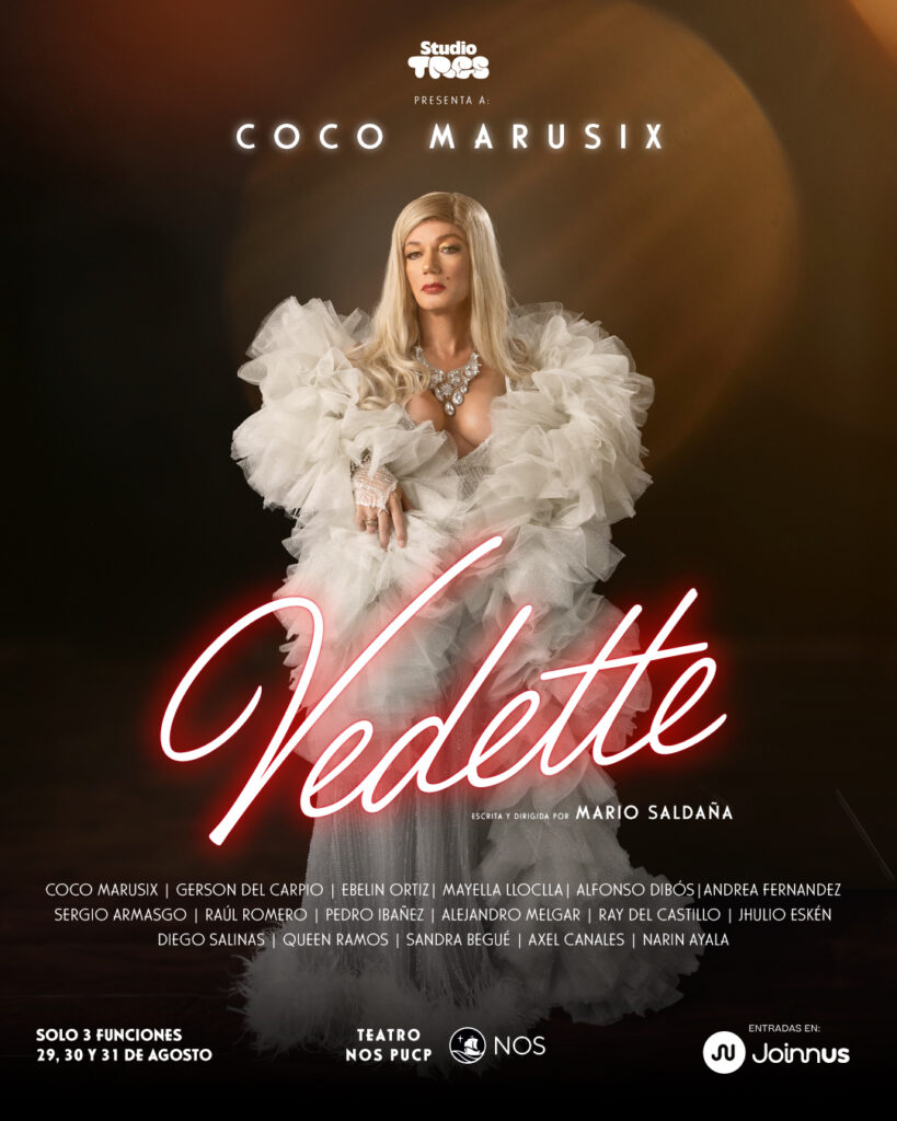 Lima, julio 2025. Coco Marusix, ícono del café-teatro, pionera del transformismo en el Perú y figura emblemática de la televisión nacional en los años 90, regresa al escenario con un espectáculo que nadie se puede perder. “Vedette, la historia de Coco Marusix”, escrita y dirigida por Mario Saldaña y producida por Studio Tres, es un musical íntimo, deslumbrante y profundamente humano que recorre su vida y legado.