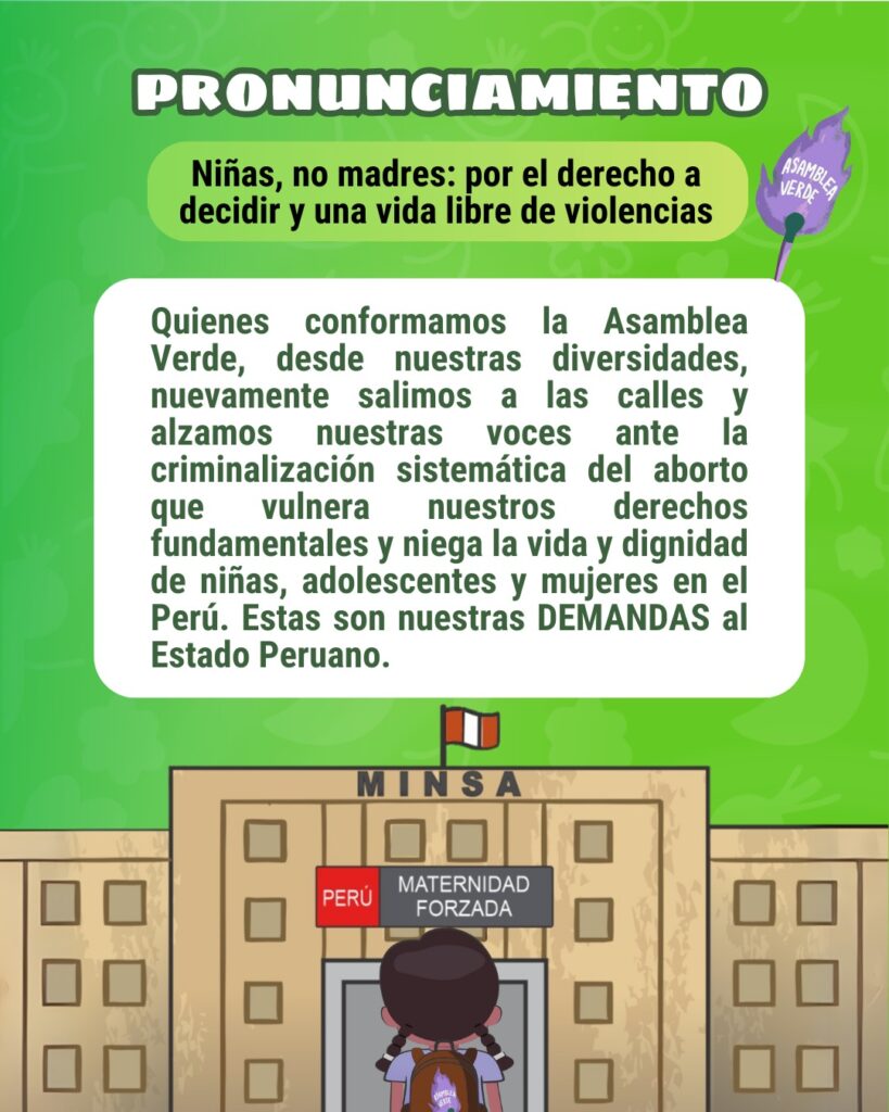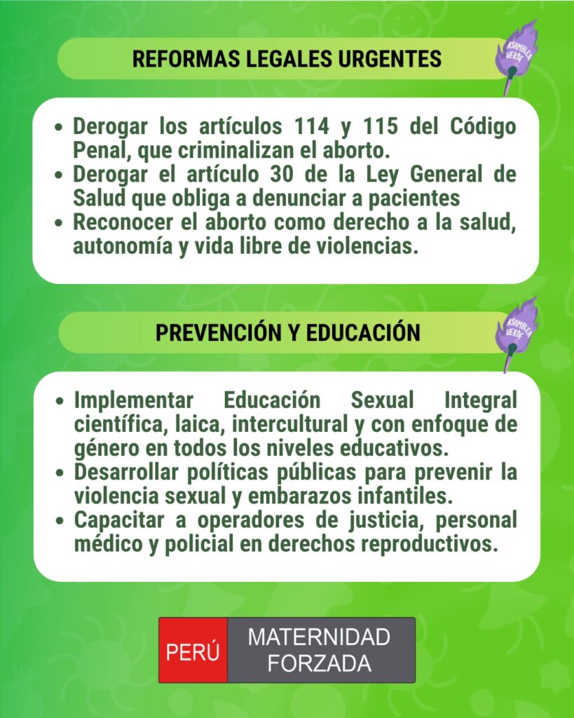 Alzamos nuestra voz de protesta y denunciamos la criminalización de las que somos víctimas, así como todo caso de vulneración de nuestros derechos al acceso del aborto terapéutico, especialmente en las zonas más alejadas y olvidadas del país. El derecho a decidir sobre nuestros cuerpos también incluye el derecho a escoger con quien relacionarnos sexualmente, y, ese sentido, denunciamos todo caso de violencia sexual, como las más de 800 niñas awajún y wampis de Condorcanqui que fueron violentadas por sus profesores y que hasta el día de hoy siguen en la impunidad. Asimismo, exigimos el acceso a la Educación Sexual Integral, el desarrollo de políticas públicas para prevenir que esto vuelva a suceder, así como la derogación de los proyectos de ley que intentan coartar nuestros derechos. También tenemos acciones directas desde el amor en nuestras comunidades y barrios porque estamos a favor de la vida, la familia y queremos un país donde podamos vivir sin miedo.