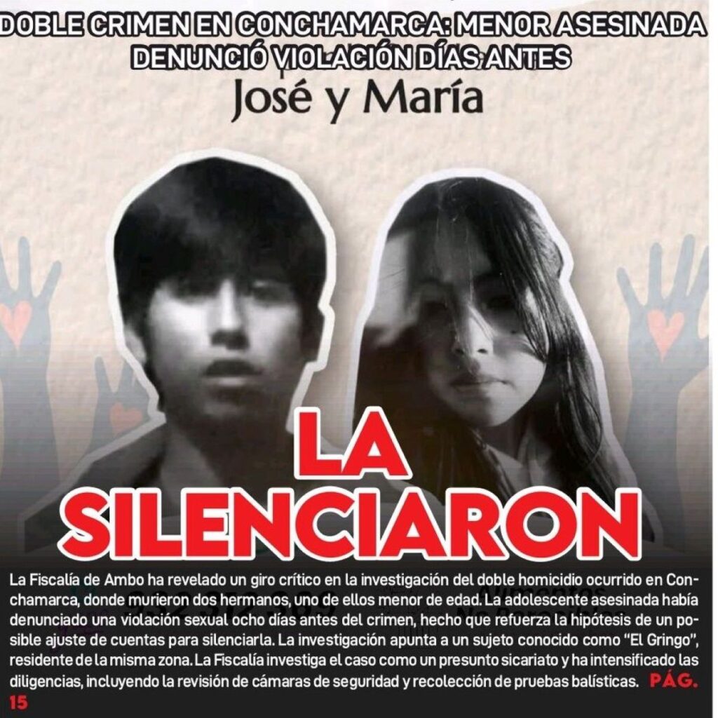 Recordemos que el 21 de octubre del presente año, la ciudadana Yeni Ríos, madre de los dos asesinados, denunció el intento de violación sexual cometido contra su hija por Luisin Melgar Magariño, conocido en la zona como «El Gringo». Este agresor merodeaba libre por la misma localidad de Conchamarca, Ambo, en donde residía la adolescente agredida. Y a pesar de la urgencia, la diligencia fiscal clave, la entrevista en cámara Gesell donde la menor relataría los hechos en un entorno protegido, fue programada recién para la quincena de noviembre.