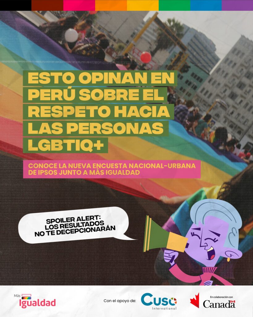Para conocer la percepción ciudadana, una encuesta urbano nacional, realizada por IPSOS y Más Igualdad Perú, recogió información sobre los derechos de las personas LGBTIQ+. En dicho estudio se revela un alto nivel de respaldo al respeto de la orientación sexual y la identidad de género, así como al reconocimiento legal de las familias conformadas por parejas del mismo sexo. La encuesta también evidencia una desaprobación mayoritaria hacia candidaturas políticas que utilizan discursos de odio como estrategia a las elecciones generales de 2026.